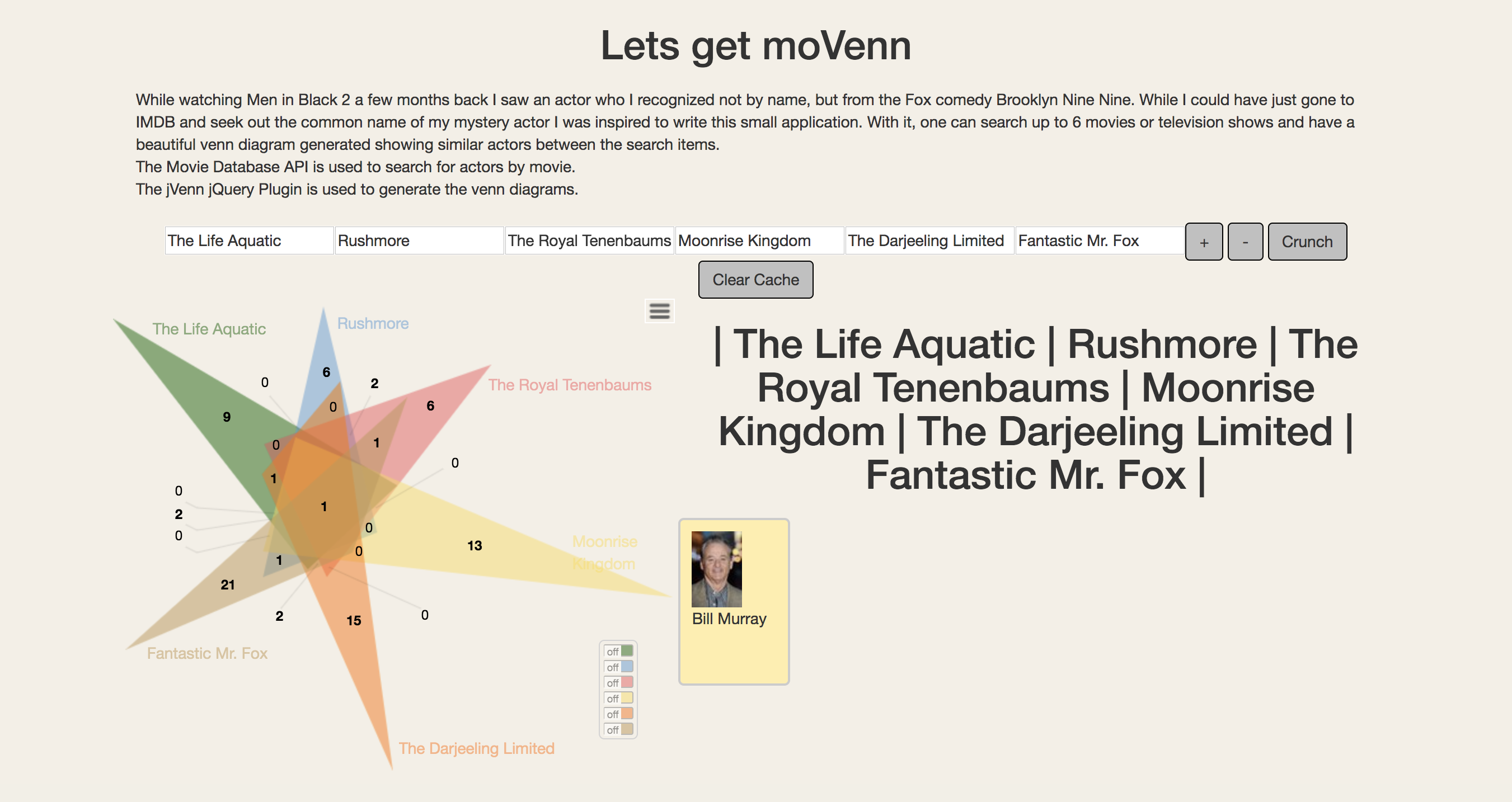 This is another one of my pet projects that allows the user to enter up to 6 movies and find similar actors between them. I used the open API from The Movie Database to grab movie details in tandem with the jVenn plugin for jQuery to create interactive charts to display the results.