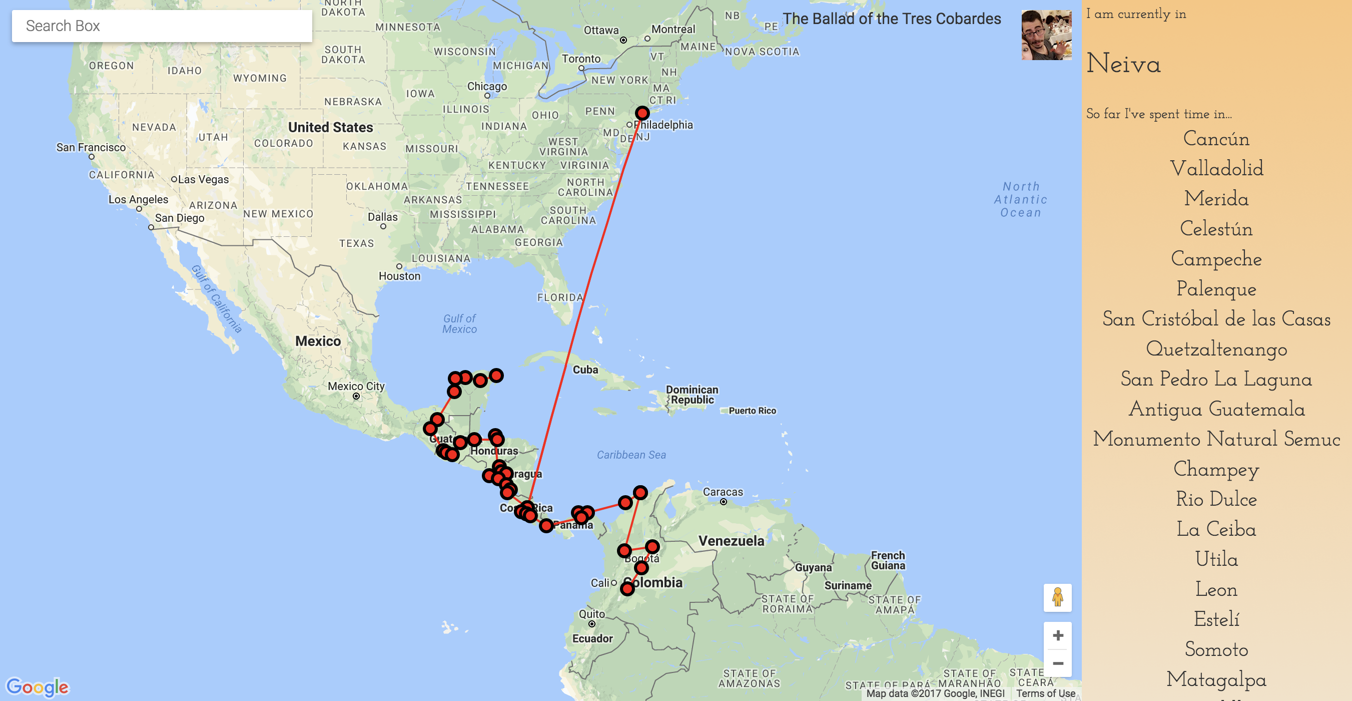 This is a personal endeavor of mine, created during a backpacking trip through Central America. I found that there wasn't a great visual way to represent a long backpacking-style trip, so I sought to make one for myself. Using the Google Maps API I was able to create a system in which users could search for certain cities and could add them to their interactive map. Login happens through Facebook, and statistics are kept so you can keep track of where you've been and how long you've been traveling.