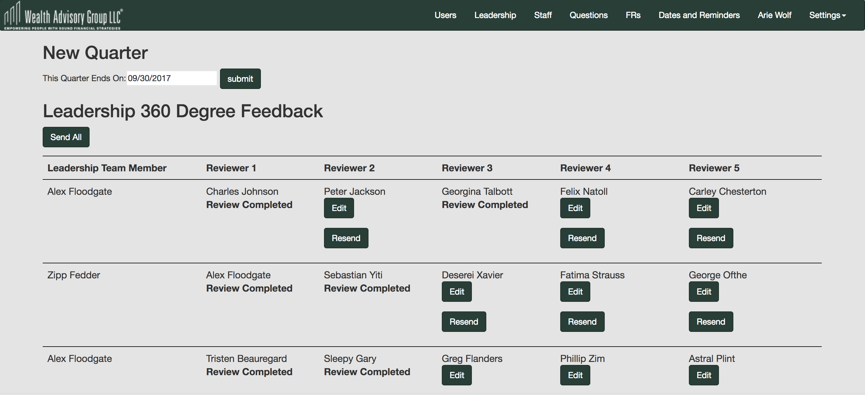 Wealth Advisory Group was looking for a streamlined system in which they could ascertain feedback from their employees. We worked together closely to develop this system, where each leadership and staff member could log in to access their reviews. At the beginning of each quarter, 5 employees are randomly selected out of certain pools and an admin can send email through the system to let the employees know that the peer reviews are ready for completion.